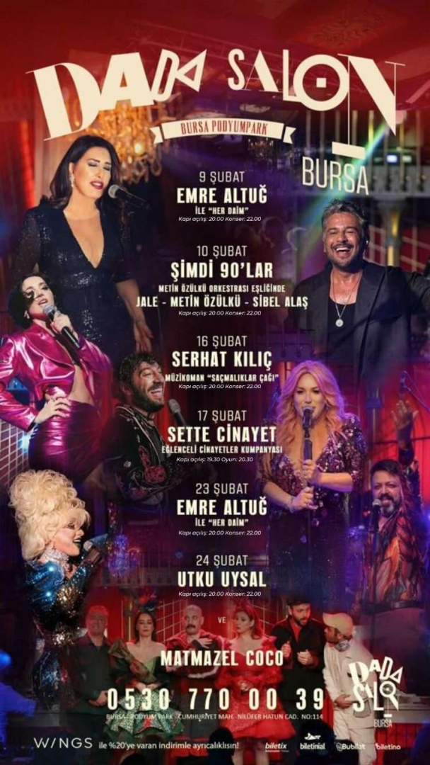 Açıldığı günden bu yana tam not alan Dada Salon Kabarett, Emre Altuğ’u 9 ve 23 Şubat’ta Bursalılar ile buluşturacak. “Su Gibisin”, “Bu Kadar Mı”, “Gidecek Yerim Mi Var”, “Kapış Kapış” ve “Aşk-ı Kıyamet” gibi bir dönemlere damgasını vuran şarkılarını Bursalılar için seslendirecek olan sanatçı, sahnesiyle herkesi büyülemeye hazırlanıyor. Hayata keyifli bir ara vermek için Emre Altuğ’u izlemelisiniz.