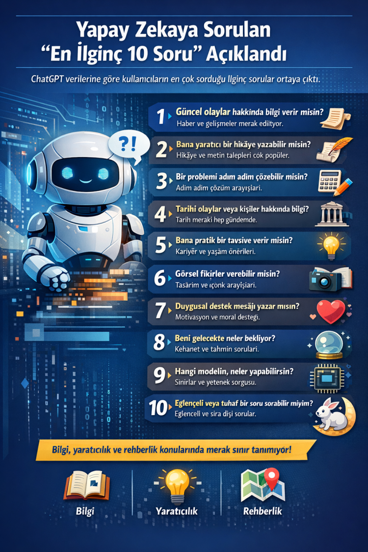 ChatGPT verilerine göre kullanıcılar, bilgi arayışı, yaratıcı içerik ve kişisel rehberlik için yapay zekâya yöneliyor. En çok sorulanlar: güncel olaylar, hikâye yazma, problem çözme, tarih bilgisi ve tavsiye isteme. Meraklı sorular da dikkat çekiyor.