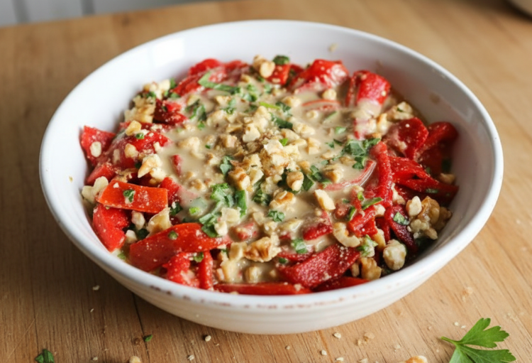 -Üstüne ufalanmış beyaz peynir, dövülmüş sarımsak, doğranmış ceviz içi, ince doğranmış maydanoz, zeytinyağı, nar ekşisi ve sirkeyi gezdirin.