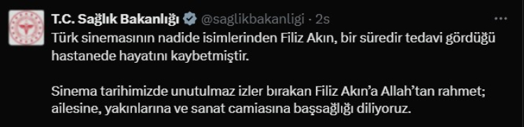 "Türk sinemasının nadide isimlerinden Filiz Akın, bir süredir tedavi gördüğü hastanede hayatını kaybetmiştir. Sinema tarihimizde unutulmaz izler bırakan Filiz Akın’a Allah’tan rahmet; ailesine, yakınlarına ve sanat camiasına başsağlığı diliyoruz."