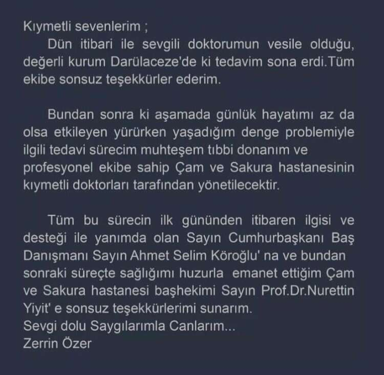 Sanat dünyasının sevilen isimlerinden Zerrin Özer, bir süredir kronik rahatsızlığı sebebiyle Darülaceze'de tedavi görüyordu. Aile ve Sosyal Hizmetler Bakanı Mahinur Göktaş da geçtiğimiz günlerde Zerrin Özer'i Darülaceze'de ziyaret etmiş, sanatçının tedavisini takip edeceklerini söylemişti. Son zamanlarda yaşadığı denge problemleri nedeniyle Başakşehir Çam ve Sakura Şehir Hastanesi'nde tedavi altına alınan Özer, sağlık durumu ile ilgili sosyal medya hesabından açıklama yaptı. Darülaceze'deki tedavisinin sona erdiğini, bundan sonraki tedavi sürecinin Başakşehir Çam ve Sakura Şehir Hastanesi'nde devam edeceğini belirten Özer, Cumhurbaşkanı Başdanışmanı Ahmet Selim Köroğlu ile Çam ve Sakura Şehir Hastanesi Koordinatör Başhekimi Prof. Dr. Nurettin Yiyit’e teşekkürlerini iletti.