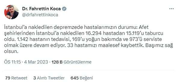 Sağlık Bakanı Fahrettin Koca, “Afet şehirlerinden İstanbul’a nakledilen 16 bin 294 hastadan 15 bin 119’u taburcu oldu. 33 hastamızı maalesef kaybettik. Başımız sağ olsun” dedi.