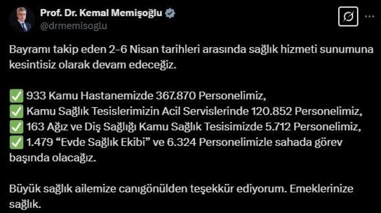 Sağlık Bakanı Kemal Memişoğlu, sosyal medya hesabından yaptığı paylaşımda bayramın ardından 2-6 Nisan tarihleri arasında sağlık hizmetlerinin kesintisiz devam edeceğini vurguladı. Bakan Memişoğlu paylaşımında şu ifadelere yer verdi:
