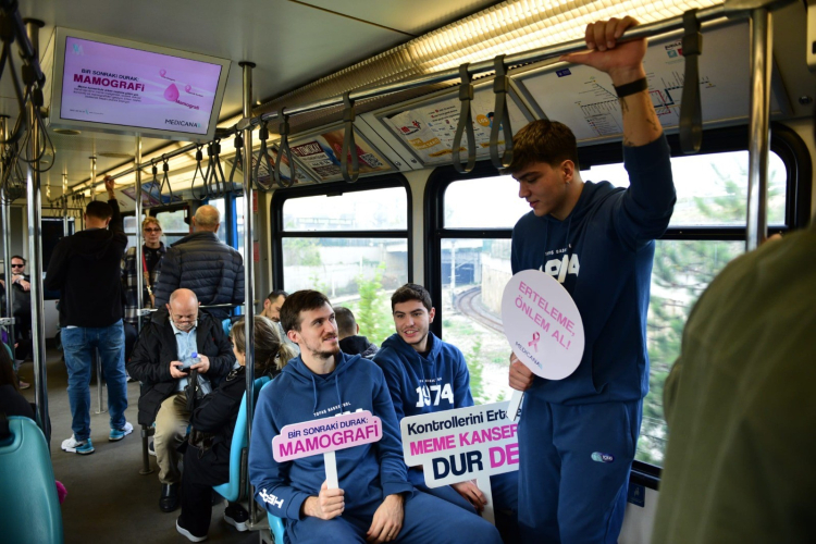 Bursa metrosunda yolculuk yapan sporcular, ellerinde erken teşhis ve düzenli kontrol mesajlarının yer aldığı pankartlarla 'Bir sondaki durak: Mamografi' olan durakta inerek, düzenli hekim kontrolü ve mamografinin erken teşhisteki kritik rolünü vurguladı. Odunluk metro istasyonunu kullanan vatandaşlar, pembe süslenen istasyonda meme kanserinde erken teşhise giden yolun haritası, kendi kendine meme muayenesi, düzenli hekim kontrolü ve mamografi mesajlarıyla kontrolün önemini bir kez daha akıllarına kazıdı.