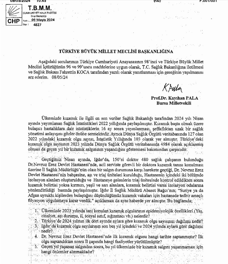 CHP’li Pala soru önergesinde Fahrettin Koca’ya; ülkemizde 2023 yılında tanı konulan kızamık olgularının epidemiyolojik özelliklerini; 2024 yılının ilk dört ayında aylara göre kızamık olgu sayısını, ülkemizde kızamık salgını yaşanmaması için alınan tedbirleri; Iğdır özelinde ise son 5 yıl ve 2024 yılının ilk dört ayında tanı konulan kızamık olgu sayılarını, Dr. Nevruz Erez Devlet Hastanesinde ilk kızamık olgusunun hangi tarihte görüldüğünü ve ilk olgu saptandıktan sonra İl çapında hangi faaliyetlerin yürütüldüğünü sordu.