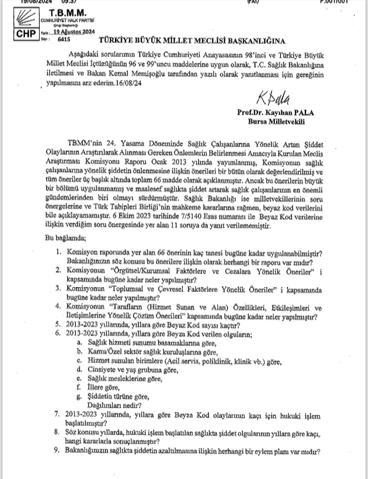 Cumhuriyet Halk Partisi Bursa Milletvekili ve Halk Sağlığı Profesörü Dr. Kayıhan Pala tarafından Sağlık Bakanı Kemal Memişoğlu’na verilen son soru önergesi, bu sorunun boyutlarını bir kez daha gözler önüne serdi. 2013 yılında hazırlanan TBMM Meclis Araştırması Komisyonu Raporu'nda, sağlık çalışanlarına yönelik şiddeti önlemek için 66 maddelik kapsamlı bir öneriler listesi sunulmuştu. Pala, bu önerilerin büyük bir bölümünün uygulanmadığını ve sağlıkta şiddetin önemli bir sorun olarak devam ettiğini belirtiyor.