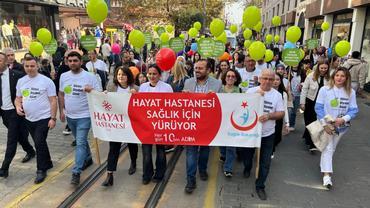 Dünya Diyabet Günü'ne dikkat çekmek isteyen sağlık çalışanları, cadde boyunca vatandaşların alkışları arasında yürüdü. Daha sonra ellerindeki yeşil balonları, gökyüzüne saldı.