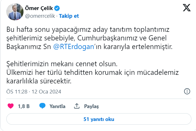 AK Parti Genel Başkan Yardımcısı, Parti Sözcüsü Ömer Çelik, “Bu hafta sonu yapacağımız aday tanıtım toplantımız şehitlerimiz sebebiyle, Cumhurbaşkanımız ve Genel Başkanımız Recep Tayyip Erdoğan’ın kararıyla ertelenmiştir” dedi