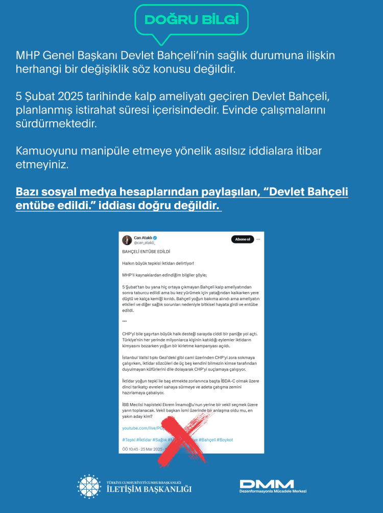 İletişim Başkanlığı, bazı sosyal medya hesaplarından paylaşılan, “Devlet Bahçeli entübe edildi.” iddiası doğru olmadığını duyurdu.