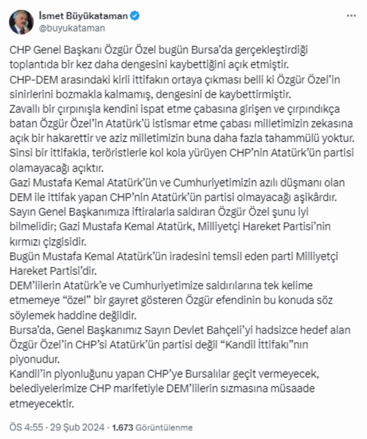MHP Genel Sekreteri İsmet Büyükataman “CHP Genel Başkanı Özgür Özel bugün Bursa’da gerçekleştirdiği toplantıda bir kez daha dengesini kaybettiğini açık etmiştir” diyerek şu açıklamayı yaptı: