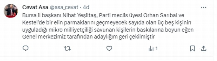 Cevat Asa haberi sosyal medyadan paylaşarak "Bursa il başkanı Nihat Yeşiltaş, Parti meclis üyesi Orhan Sarıbal ve Kestel'de bir elin parmaklarını geçmeyecek sayıda olan üç beş kişinin uyguladığı mikro milliyetçiliği savunan kişilerin baskılarına boyun eğen Genel merkezimiz tarafından adaylığım geri çekilmiştir" açıklamasını yaptı.
