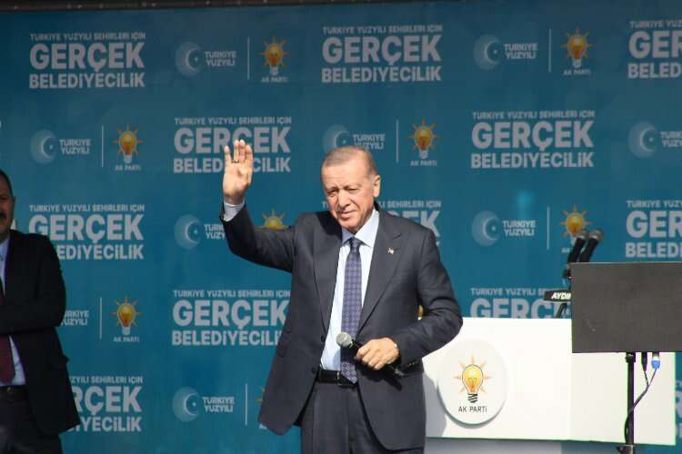 Ramazan Bayramı öncesinde 31 Mart'taki seçimleri kazanarak milli irade bayramı ilan edeceklerini kaydeden Erdoğan, "Her kim size vizyonsuz projesiz vaatlerde bulunursa emin olun söylediklerini yapamayacağı gibi, sizi elinizdekilerden de edecektir. Biz Türkiye'yi lafla değil, çalışarak, üreterek, alın teri dökecek, tehditlere direnerek büyütmeyi sizlere taahhüt ediyoruz. Aydın'ın da bu kutlu yolculuğun lokomotiflerden biri olacağına inanıyorum. Öyleyse buradan ses verin ki emperyalistlerin de ve maşalarının da kulakları çınlasın. Aydın, 31 Mart'ta milli irade bayrağını bir kez daha yükseltmeye var mıyız? Türkiye yüzyılı şehirleri için hazır mıyız? 31 Mart'ta Türkiye yüzyılı şehirleri için kararlı mıyız? 31 Mart'ta gerçek belediyeciliği tercih ediyor muyuz? Bunun için seçim gününe kadar, ana kademe, kadın kolları ve gençler kapı kapı dolaşmaya var mıyız? Aydınla birlikte Türkiye haritasının tamamını Cumhur İttifakı'nın renkleri ile boyamaya var mıyız? Ramazan ayı yaklaşıyor. Bu mübarek günleri gündüzü ile ayrı, gecesi ile ayrı değerlendirmeliyiz. İnşallah Ramazan Bayramı gelmeden 31 Mart'ta milli irade bayramını ilan edeceğiz. Demokrasi ve kalkınma yolculuğumuzun bu durağını da zaferle geride bırakacağız" dedi.
