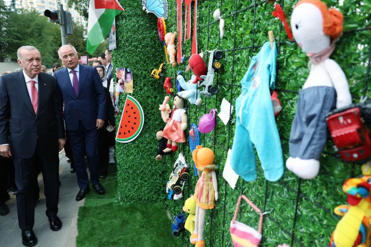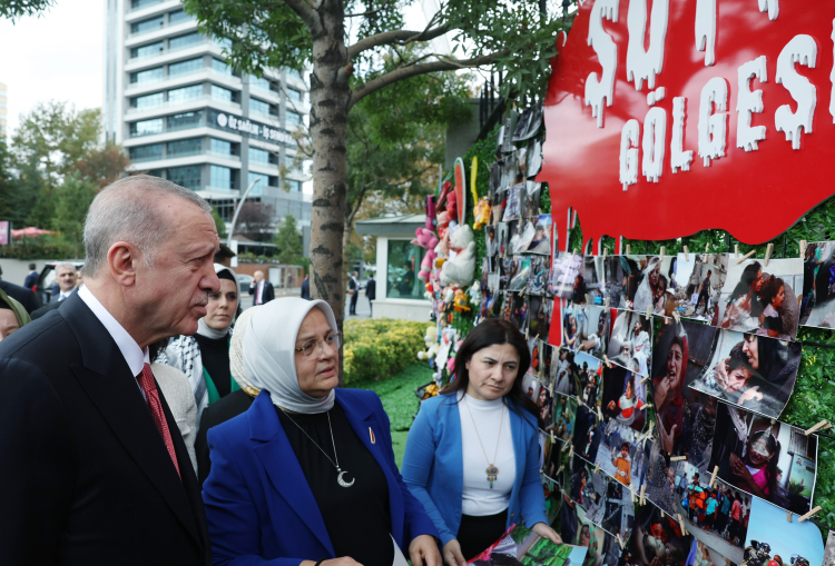 Erdoğan, AK Genel Merkez Kadın Kolları Başkanı Ayşe Keşir'den bilgi alarak İsrail saldırılarında yaralanan bir çocuğun fotoğrafını panoya astı.