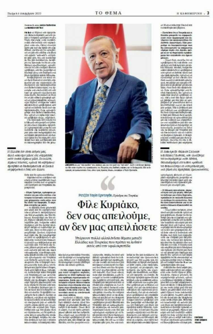Cumhurbaşkanı Recep Tayyip Erdoğan, Atina ziyareti öncesinde Yunan Kathimerini gazetesine verdiği röportajda, “Kiryakos, dostum, siz bizi tehdit etmedikçe biz de sizi tehdit etmiyoruz. Gel iki ülke arasındaki güveni sağlamlaştıralım” dedi.