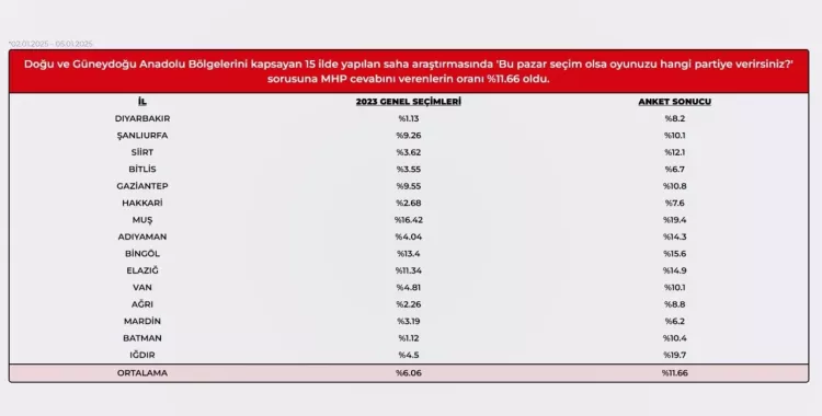 Ankette yer alan iller arasında, Diyarbakır, Batman, Mardin, Siirt, Hakkari, Van, Bitlis, Muş, Bingöl, Adıyaman, Elazığ, Şanlıurfa ve Gaziantep bulunmaktadır. MHP'nin bu illerdeki oy oranındaki büyük artış dikkat çekici.