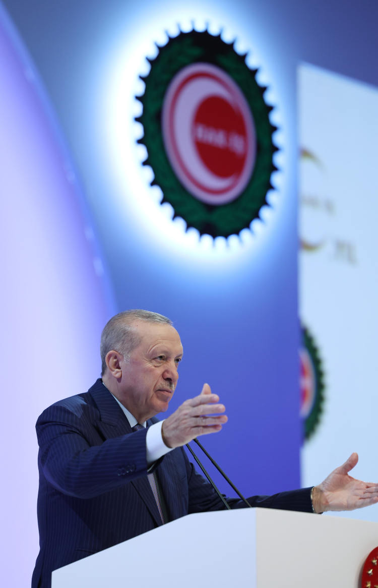 Türkiye’nin bugünlere gelmesine katkı sunanların en başında işçilerin, çalışanların, emekçilerin geldiğini belirten Cumhurbaşkanı Erdoğan, "Bugün şunu çok net bir şekilde görüyor ve gönül rahatlığıyla söylüyorum: Şimdiye kadar olduğu gibi, Türkiye Yüzyılında da şeref hakkı, el emeğiyle, göz nuruyla, alın teriyle helal rızkını kazanan siz emekçilerimizin olacaktır. Hükümet olarak bunun için canla, başla çalışmaya devam edeceğiz. Hangi sendika bünyesinde olursa olsun, ülkemiz ve milletimiz için çalışan tüm işçi kardeşlerimi bir kez daha saygıyla selamlıyor; Türkiye’ye yaptıkları eşsiz hizmetlerden ötürü her birine şükranlarımı ifade ediyorum. Burada şu gerçeğin altını çizmek istiyorum: Örgütlü emek ve hak mücadelesi için sendikalar elbette vazgeçilmezdir. Fakat, unutmayalım ki, sendikalarımızın varlığı işçi ile kaimdir, emekçi ile kaimdir. İşçi olduğu için, emekçi örgütlendiği için sendikalar vardır. Sadece sendikaların değil, son tahlilde işverenin varlığı da, o işi yapacak insan unsuruyla kaimdir. Biz bunları birbirine hasım gören, birbirinin adeta kanlı-bıçaklısı gören kökü dışarıda ideolojik yaklaşımları reddediyoruz. İşçiyle işvereni düşmanlaştıran anlayışın, şöyle bir geriye baktığımızda, emek mücadelesine katkıdan ziyade zarar verdiğini görüyoruz. Şurası bir gerçek ki; alın teri ve emek, hiçbir ideolojiye, hiçbir hizbe, hiçbir klik ve gruba ipotek edilemeyecek kadar kutsaldır, yücedir, hürmete layıktır" açıklamasını yaptı.