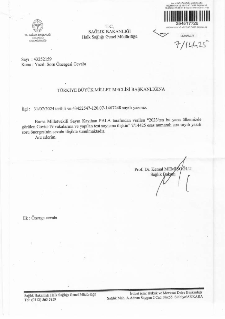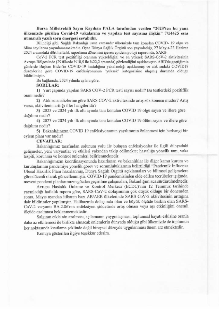 Hastalığa ilişkin verilerin açıklanmasının, hastalığın yayılmasının önlenmesi açısından büyük önem taşıdığına dikkat çeken CHP Bursa Milletvekili Halk Sağlığı Profesörü Kayıhan Pala, 24 Temmuz 2024 tarihinde Sağlık Bakanı Kemal Memişoğlu tarafından yanıtlanması için vermiş olduğu soru önergesinin daha önce vermiş olduğu önergelerde olduğu gibi, yine yanıtsız bırakıldığın, Bakanlığın önergeyi ancak 19 Eylül’de, yanıt verme süresi geçtikten çok sonra, üstelik sorulardan hiçbirine ilişkin veri veremeden yanıtladığını açıkladı.