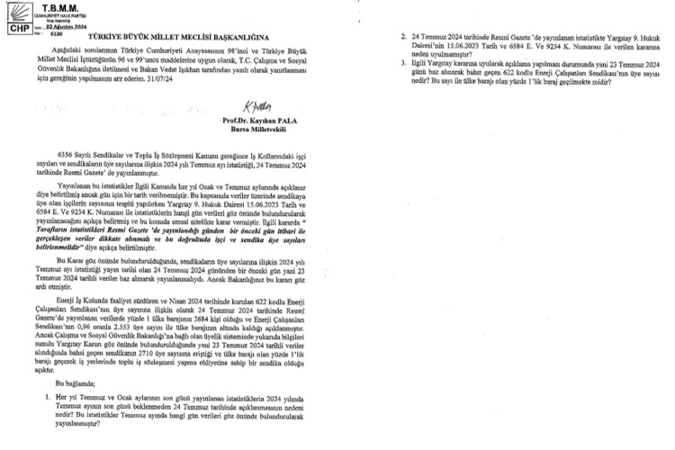 CHP'li Milletvekili Prof. Dr. Kayıhan Pala, Çalışma Bakanı'na iş kollarındaki işçi ve sendika üye sayılarının Resmî Gazete'de yayımlanmasıyla ilgili soru önergesi verdi. Yargıtay kararı göz ardı edilerek sendikaların örgütlenme hakkı gasp ediliyor. Pala, verilerin açıklanma tarihlerine ve Yargıtay kararına uyulmamasına tepki gösterdi.