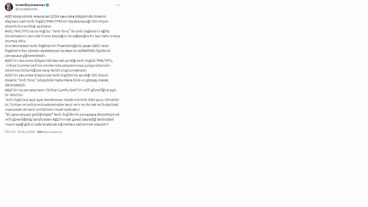 Milliyetçi Hareket Partisi Genel Sekreteri ve Bursa Milletvekili İsmet Büyükataman, ABD’nin 2024 savunma bütçesinde YPG/PKK'ya fon ayırmasına sosyal medya hesabı üzerinden yaptığı açıklama ile tepki gösterdi.