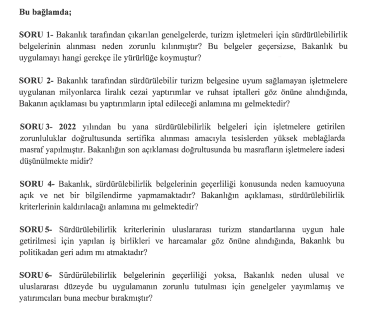 SORU 5- Sürdürülebilirlik kriterlerinin uluslararası turizm standartlarına uygun hale getirilmesi için yapılan iş birlikleri ve harcamalar göz önüne alındığında, Bakanlık bu politikadan geri adım mı atmaktadır?