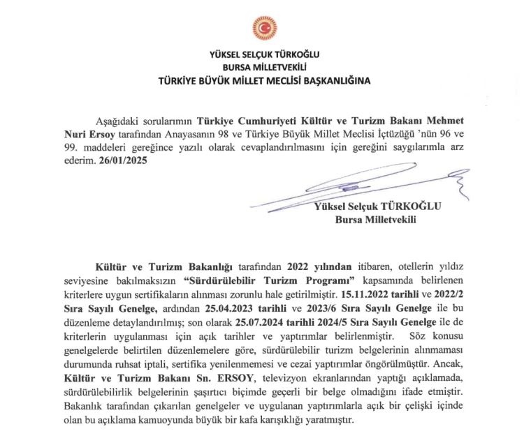 SORU 1- Bakanlık tarafından çıkarılan genelgelerde, turizm işletmeleri için sürdürülebilirlik belgelerinin alınması neden zorunlu kılınmıştır? Bu belgeler geçersizse, Bakanlık bu uygulamayı hangi gerekçe ile yürürlüğe koymuştur?