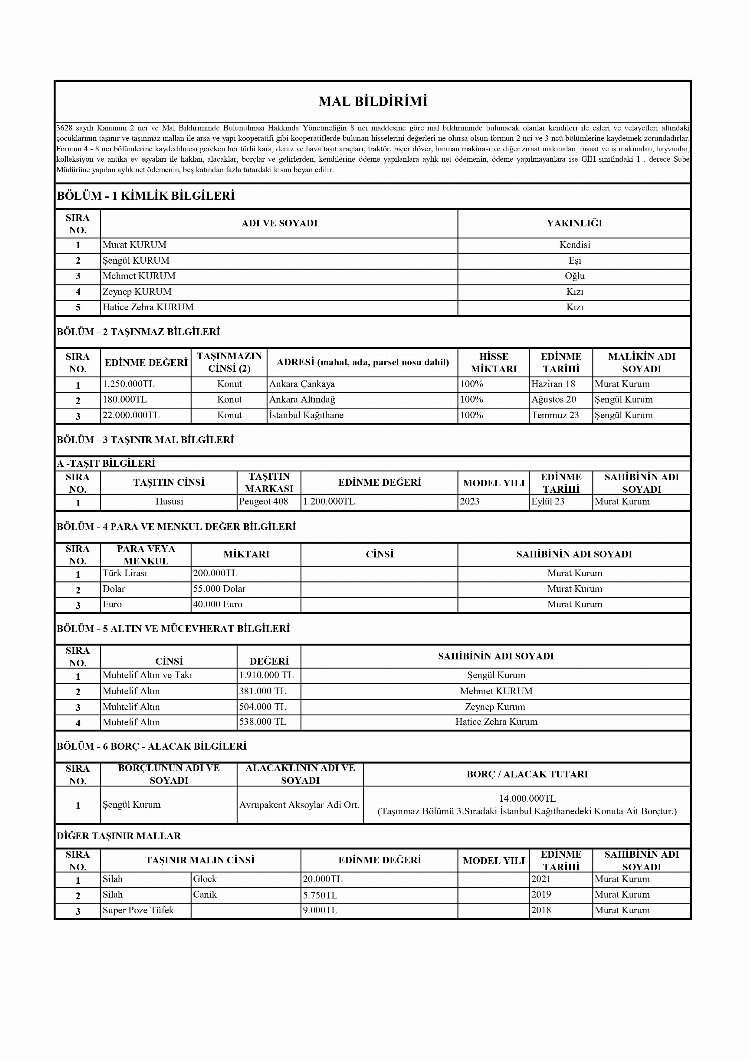 Murat Kurum’un Ankara Çankaya’da kendi adına bir evi, Şengül Kurum’un annesi ve babası için aldığı Ankara Altındağ’da bir evi, yine İstanbul Kağıthane’de oturdukları bir evleri bir de arabaları bulunuyor. Beyana göre Kurum’un edinme değeri 1 milyon 200 bin TL olan bir aracının da bulunduğu kaydedildi. Kurum’un kendi adına iki silahı bir tüfeğinin olduğu Kurum’un çocukları üzerinde 538 bin, 504 bin, 381 bin TL değerinde muhtelif altını bulunduğu ifade edildi. Eşi Şengül Kurum’un da 1 milyon 910 bin TL değerinde muhtelif altın ve takısı mevcut olduğu belirtildi.