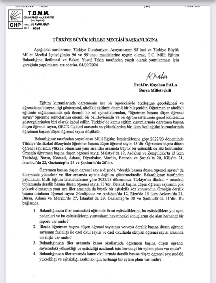 "Bakanlığınız tarafından yayınlanan Milli Eğitim İstatistiklerine göre 2022/23 döneminde Türkiye’de ilkokul düzeyinde öğretmen başına düşen öğrenci sayısı 18’dir. Öğretmen başına düşen öğrenci sayısının yüksek olmasının yanı sıra iller arasında büyük bir eşitsizlik de söz konusudur. Örneğin öğretmen başına düşen öğrenci sayısı Malatya’da 12, Ardahan ve Zonguldak’ta 13 iken Tekirdağ, Bursa, Kocaeli, Adana, Diyarbakır, Mardin, Batman ve Şırnak’ta 20, Kilis’te 21, İstanbul’da 22, Gaziantep’te 24 ve Şanlıurfa’da 26’dır.