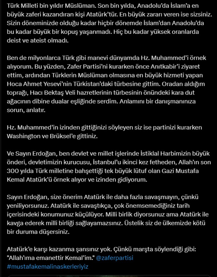 "Sayın Erdoğan, dün, 14 Eylül 2024’de Anadolu Ajansı sizin bir açıklamanızı yayınladı. “Dünya hayatında kendimize örnek aldığımız, izinden gittiğimiz, yoluna hayatımızı adadığımız tek insan Resulullah Efendimizdir." demişsiniz. Anlıyorum ki teğmenlerin “Mustafa Kemal’in askerleriyiz” diye haykırmalarına olan öfkeniz dinmemiş. Sayın Erdoğan, keşke Hz. Muhammed’i örnek almakta samimi olsaydınız. Olsaydınız, Türk halkı aç ve işsizken kendinize saray yaptırmaz, bir düzine uçak almazdınız. Hz. Muhammed’i örnek alsaydınız, “Komşusu açken tok yatan bizden değildir” der ve 5’li çeteye bütün ihaleleri vermez, adaleti gözetirdiniz. Hz. Muhammed’i örnek alıp onun yolundan gitseydiniz, “Misafirliğin uzayanı ev sahibine eziyettir” der ve 13 milyon sığınmacı ile kaçağı bu ülkeye doldurmazdınız. Hz. Muhammed’i örnek alsaydınız, onun yolundan yürüseydiniz, Yahudilerden cesaret ödülü almaz, ülkeniz bu kadar borçlu, siz ise bu kadar zengin olmazdınız. Bu listeyi çok uzatabiliriz. Aslında bu cümleyi, Hz. Muhammed’in izinden gittiğinizi düşündüğünüz için kurmadınız. Gazi Mustafa Kemal Atatürk’ü reddetmek, ona olan gizleyemediğiniz nefretinizi, öfkenizi ifade etmek için kullandınız. Türk Milleti bin yıldır Müslüman. Son bin yılda, Anadolu’da İslam’a en büyük zaferi kazandıran kişi Atatürk’tür. En büyük zararı veren ise sizsiniz. Sizin döneminizde olduğu kadar hiçbir dönemde İslam’dan Anadolu’da bu kadar büyük bir kopuş yaşanmadı. Hiç bu kadar yüksek oranlarda deist ve ateist olmadı. Ben de milyonlarca Türk gibi manevi dünyamda Hz. Muhammed’i örnek alıyorum. Bu yüzden, Zafer Partisi’ni kurarken önce Anıtkabir’i ziyaret ettim, ardından Türklerin Müslüman olmasına en büyük hizmeti yapan Hoca Ahmet Yesevi’nin Türkistan’daki türbesine gittim. Oradan aldığım toprağı, Hacı Bektaş Veli hazretlerinin türbesinin önündeki kara dut ağacının dibine dualar eşliğinde serdim. Anlamını bir danışmanınıza sorun, anlatır. Hz. Muhammed’in izinden gittiğinizi söyleyen siz ise partinizi kurarken Washington ve Brüksel’e gittiniz. Ve Sayın Erdoğan, ben devlet ve millet işlerinde İstiklal Harbimizin büyük önderi, devletimizin kurucusu, İstanbul’u ikinci kez fetheden, Allah’ın son 300 yılda Türk milletine bahşettiği tek büyük lütuf olan Gazi Mustafa Kemal Atatürk’ü örnek alıyor ve izinden gidiyorum. Sayın Erdoğan, size önerim Atatürk ile daha fazla savaşmayın, çünkü yeniliyorsunuz. Atatürk ile savaştıkça, çok önemsemediğiniz tarih içerisindeki konumunuz küçülüyor. Milli birlik diyorsunuz ama Atatürk ile kavga ederek milli birliği sağlayamazsınız. Üstelik siz de ülkemizde kötü bir duruma düşersiniz. Atatürk’e karşı kazanma şansınız yok. Çünkü marşta söylendiği gibi: "Allah’ıma emanettir Kemal’im."