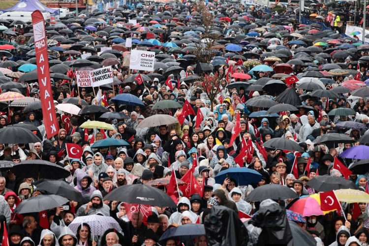 Yağmur nedeniyle sahne yerine parti otobüsü üzerinde konuşmasını yapan CHP Genel Başkanı Özgür Özel, "Denizli'de inanılmaz bir yağmur var. Kimse gelmez, millet saçak altında durur. O meydan dolmaz, bugün bu miting patlar' dediler. Dediler ki ‘Bir sahne var, önü çok büyük bir meydan.' Dedim ki ‘Yağmur varsa sahne olmaz. Millet yaşta, genel başkan kuruda olmaz.' ‘Otobüsü çekin' dedim, ‘Ben oraya gideceğim, o meydan da dolacak. Rahmet yağacak, o meydan tıklım tıklım olacak.' İşte Saraçhane ruhuyla, mücadele ruhuyla, eylem ruhuyla bu meydanı dolduranlara helal olsun, selam olsun. Canım Denizli'me, güzel Denizli'me, yiğit Denizli'me selamlar olsun. Bugün bu meydanda itiraz edenler var. Her türlü haksızlığa, vicdansızlığa, eşitsizliğe itiraz edenler var. Cumhurbaşkanı adayımızın tutukluluğuna itiraz da bu meydanda, asgari ücretin ev geçindirememesinden mustarip emekçi de bu meydanda. Açlık sınırının üçte ikisine mahkum edilen emekli de bu meydanda, pamuk üreticisi beyaz altın üretirken şimdi borç batağında olan çiftçi de bu meydanda. Siftahsız esnaf da bu meydanda. İtiraz etmeye, mücadele etmeye, direnmeye, eylem yapmaya geldik Denizli'de. ‘Umudunu kesmiş gençler, valizleri zihninde toplamış ve ‘Fırsat olursa yurt dışına giderim, başka ülkede yaşarım' diyen gençler 31 Mart akşamı bir seçim daha beklemeye karar vermişlerdi' demiştim. Şimdi o gençler; belki yoksul, barınma sorunu olan, her türlü güçlükle baş eden ama umudu diri olan gençler burada. Genciyle yaşlısıyla, emeklisiyle, emekçisiyle, köylüsüyle, esnafıyla selam olsun sizlere, hepinize" dedi.