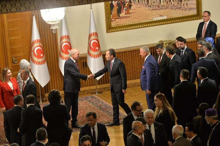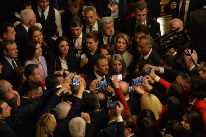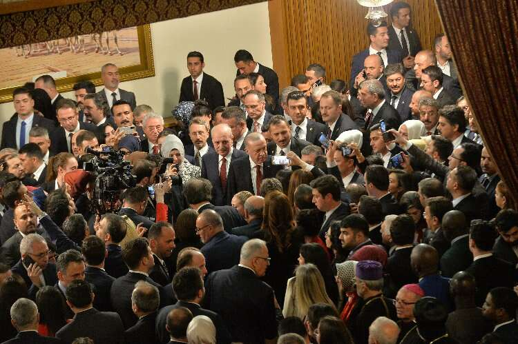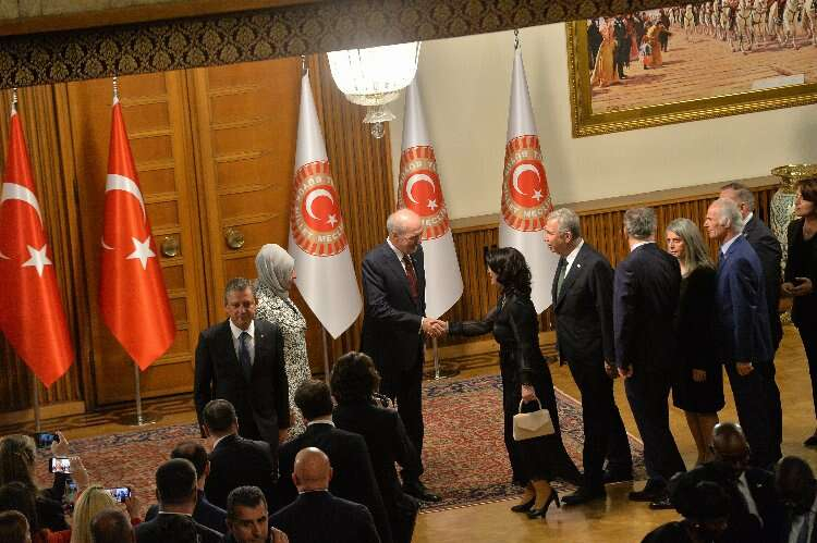 TBMM’de düzenlenen 23 Nisan resepsiyonuna, Cumhurbaşkanı Recep Tayyip Erdoğan, CHP Genel Başkanı Özgür Özel, kabine üyeleri, kuvvet komutanları, yabancı misyon şefleri, siyasi parti liderleri ve diğer yetkililer katıldı.