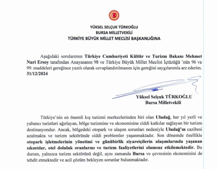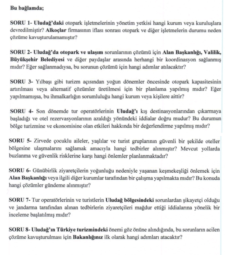 Kültür ve Turizm Bakanlığına 8 soruluk önerge veren Türkoğlu, “Uludağ’daki otopark işletmelerinin yönetim yetkisi hangi kurum veya kuruluşlara devredilmiştir? Alkoçlar firmasının iflası sonrası otopark ve diğer işletmelerin durumu neden çözüme kavuşturulamamıştır?” diye sordu. Türkoğlu’nun soru önergesi aynen şöyle: TÜRKİYE BÜYÜK MİLLET MECLİSİ BAŞKANLIĞI’NA