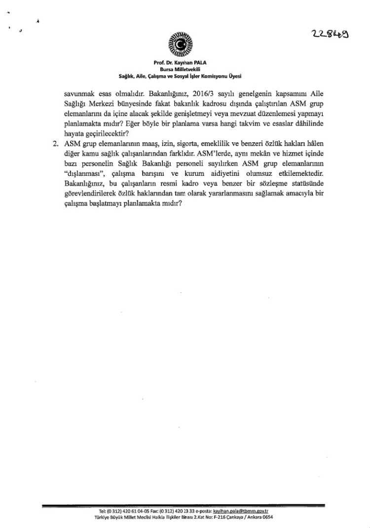 CHP Bursa Milletvekili Prof. Dr. Kayıhan Pala, Aile Sağlığı Merkezlerinde (ASM) çalışan “ASM Grup Elemanları”nın özlük hakları ve hukuki güvencelerden mahrum kalmasıyla ilgili olarak Sağlık Bakanı Kemal Memişoğlu’nun yanıtlaması istemiyle TBMM’ye bir yazılı soru önergesi daha sundu. Pala, sayıları 13 bini aştığı ifade edilen ASM Grup Elemanlarının, resmen sağlık çalışanı kabul edilmedikleri için önemli hak kayıplarına uğradıklarını ve özellikle şiddet vakalarında “beyaz kod” sisteminden yararlanamadıklarını vurguladı.