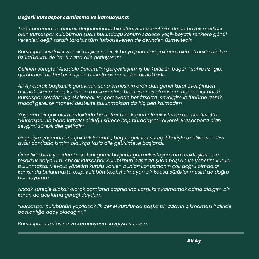 Ali Ay, açıklamalarını şu şekilde sürdürdü: “Geçmişte yaşananlara çok takılmadan, bugün gelinen süreç itibariyle özellikle son 2-3 aydır camiada ismim oldukça fazla dile getirilmeye başlandı. Öncelikle beni yeniden bu kutsal görev başında görmek isteyen tüm renktaşlarımıza teşekkür ediyorum. Ancak Bursaspor Kulübü'nün başında şu an başkan ve yönetim kurulu bulunmakta. Mevcut yönetim kurulu varken bunları konuşmanın çok doğru olmadığı kanısında bulunmakta olup, kulübün telafisi olmayan bir kaosa sürüklenmesini de doğru bulmuyorum. Ancak süreçle alakalı olarak camianın çağrılarına karşılıksız kalmamak adına aldığım bir kararı da açıklama gereği duydum. 'Bursaspor Kulübü’nün yapılacak ilk genel kurulunda başka bir adayın çıkmaması halinde başkanlığa aday olacağım' Bursaspor camiasına ve kamuoyuna saygıyla sunarım.”