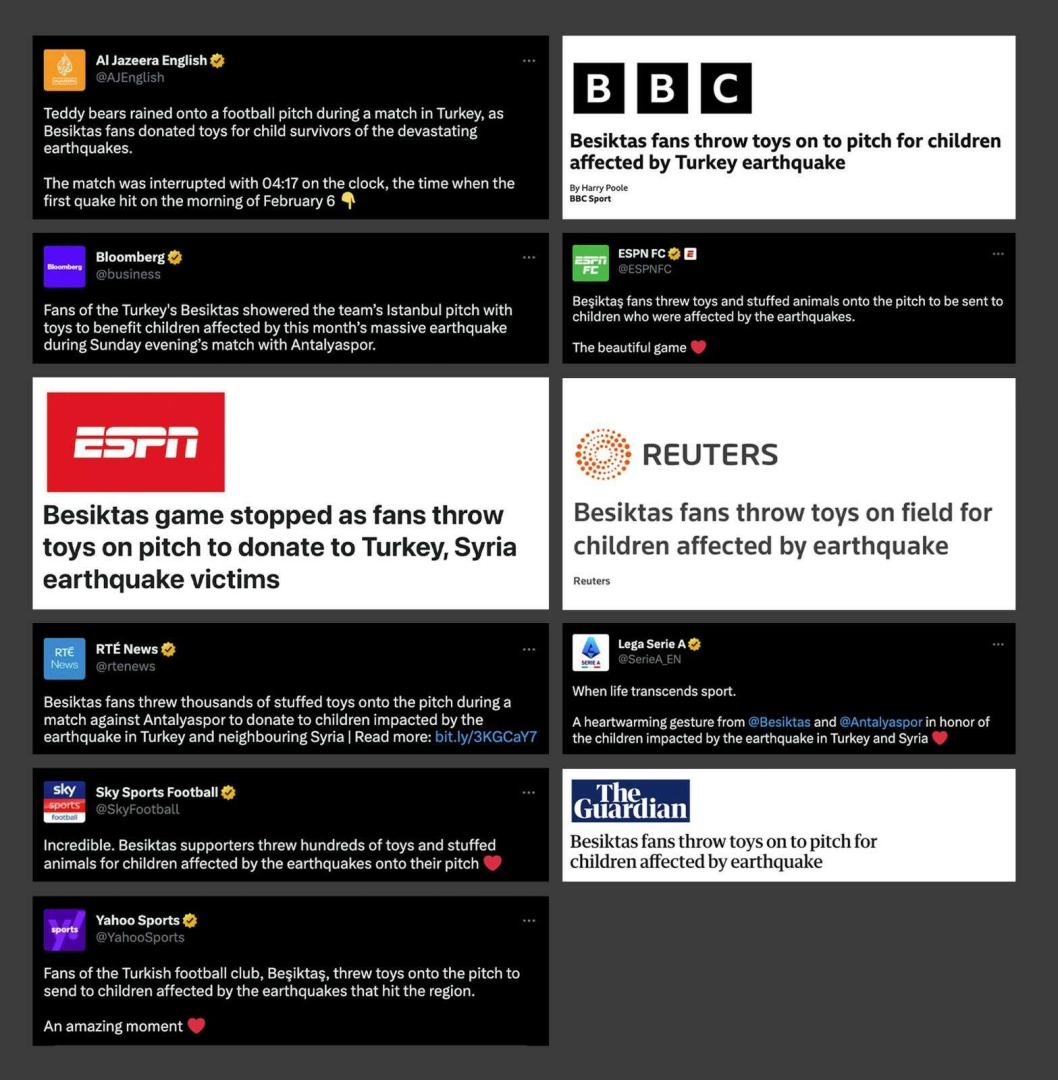 “Beşiktaş taraftarları depremden kurtulan çocuklara oyuncak bağışlarken, maç sırasında futbol sahasına oyuncak ayılar yağdı.” Yahoo Sport