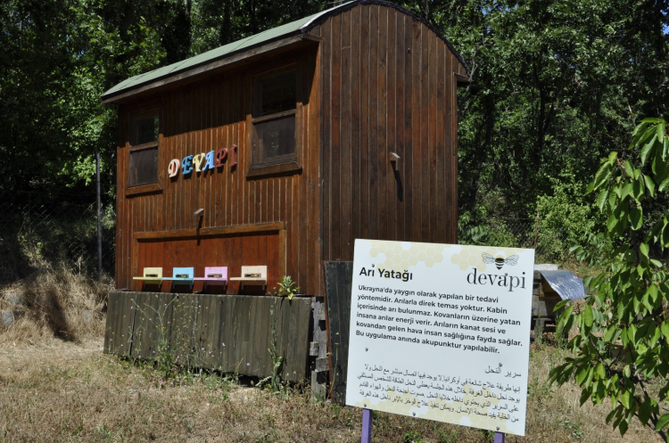 Kovanın içindeki arıları sessiz bir ortamda duyabilen insanların rahatladıklarını ve daha dinç olduklarını söyleyen Dr. Dursun Ünal, “Bu bahçeyi 9 yıl önce tıbbi aromatik bahçe olarak kurduk. Aynı zamanda bal arılarını da buraya ekleyerek apiturizm ile birleştirdik. Bal arıları, çiçeklerin en yoğun açtığı dönemde bir kovanda ortalama 60-70 bin sayıyı bulabiliyor. Bu dönemlerde de arı yatağı uygulaması yapabiliyoruz. Sayıları ne kadar çoksa, üzerinde yatan insana enerji veriyor. Kovana getirdikleri uçucu yağ asitlerinin kokusu kabine yayılıyor. Kanatlarından verdikleri sesin frekansı insan vücuduna etki etmektedir. Bu mekanizmayla üzerinde yatan insana büyük bir dinçlik uyandırmaktadır. Özellikle Rusya'da yaygın olarak yapılıyor. Avrupa'da da apiturizm oldukça gelişti, insanların ilgisini çeker hale geldi. Arı yatağına giren insanın, arı ile teması söz konusu değildir. Arıların giriş yönü kabinin farklı tarafında, insanlar ise başka bir taraftan girmektedir. İnsan ve arılar arasındaki ince tahta üzerindeki ızgaradan gelen ses, koku ve enerji, insana fayda sağlıyor” ifadelerini kullandı.