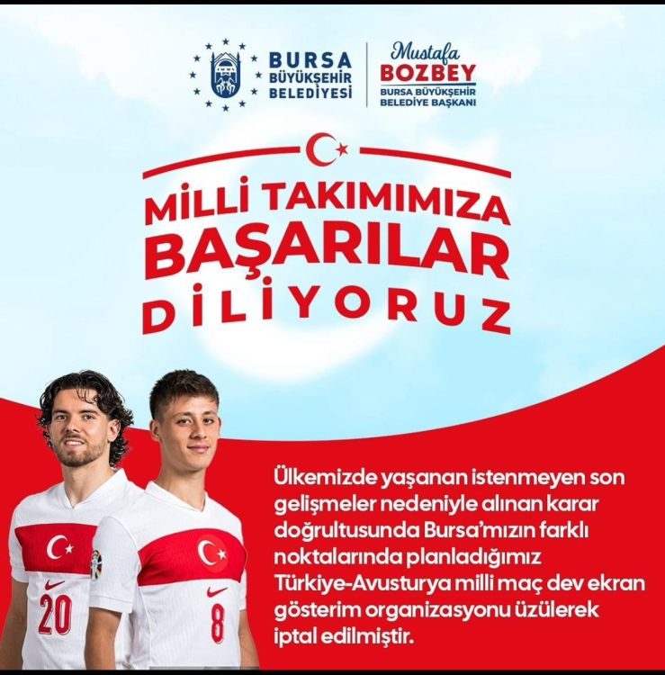 Ülkemizde yaşanan istenmeyen son gelişmeler, nedeniyle alınan karar doğrultusunda Bursa'mızın farklı noktalarında planladığımız Türkiye-Avusturya milli maç dev ekran gösterim organizasyonu üzülerek iptal edilmiştir. Anlayışınız ve duyarlılığınız için teşekkür eder, Milli Takımımıza başarılar dileriz. Size inanıyoruz, size güveniyoruz, haydi bizim çocuklar çeyrek finale!