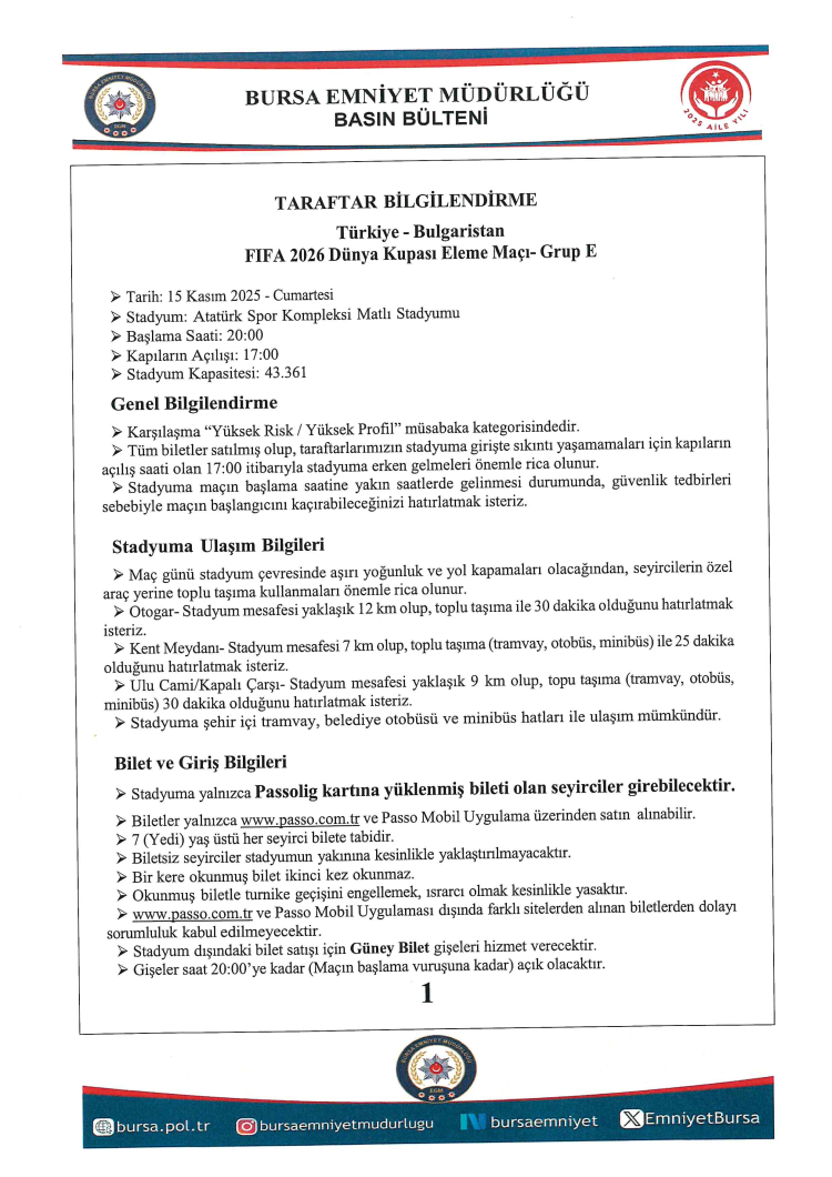 A Milli Futbol Takımımız’ın 15 Kasım Cumartesi akşamı saat 20.00’de Bulgaristan ile Bursa Atatürk Spor Kompleksi Matlı Stadyumu’nda oynayacağı 2026 FIFA Dünya Kupası Avrupa Elemeleri E Grubu karşılaşması öncesi, Bursa İl Emniyet Müdürlüğü alınan güvenlik önlemlerini kamuoyuyla paylaştı.