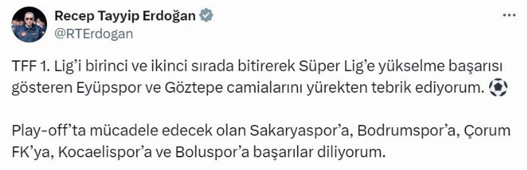 Cumhurbaşkanı Recep Tayyip Erdoğan, sosyal medya hesabından, TFF 1. Lig’den Süper Lig’e yükselen takımlara ilişkin yaptığı paylaşımda, "TFF 1. Lig’i birinci ve ikinci sırada bitirerek Süper Lig’e yükselme başarısı gösteren Eyüpspor ve Göztepe camialarını yürekten tebrik ediyorum. Play-off’ta mücadele edecek olan Sakaryaspor’a, Bodrumspor’a, Çorum FK’ya, Kocaelispor’a ve Boluspor’a başarılar diliyorum" ifadelerine yer verdi.