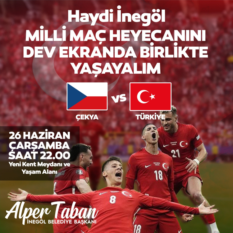 26 Haziran Çarşamba akşamı 22.00’da başlayacak maç için Yeni Kent Meydanı ve Yaşam Alanında dev ekran kurulacak. İnegöllüler burada ay yıldızlıların Avrupa Şampiyonası mücadelesini tüm şehir tek yürek izleyecek.