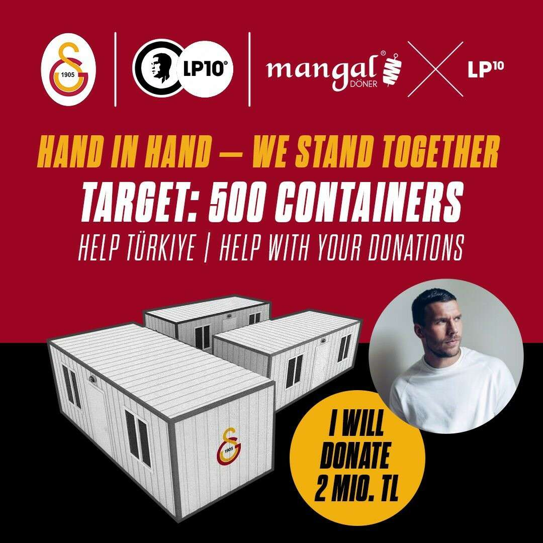 Galatasaray’ın başlattığı konteyner projesine Galatasaray ve Antalyaspor'un eski futbolcusu Lukas Podolski, depremzedeler için 2 milyon TL bağış yapacağını duyurdu.