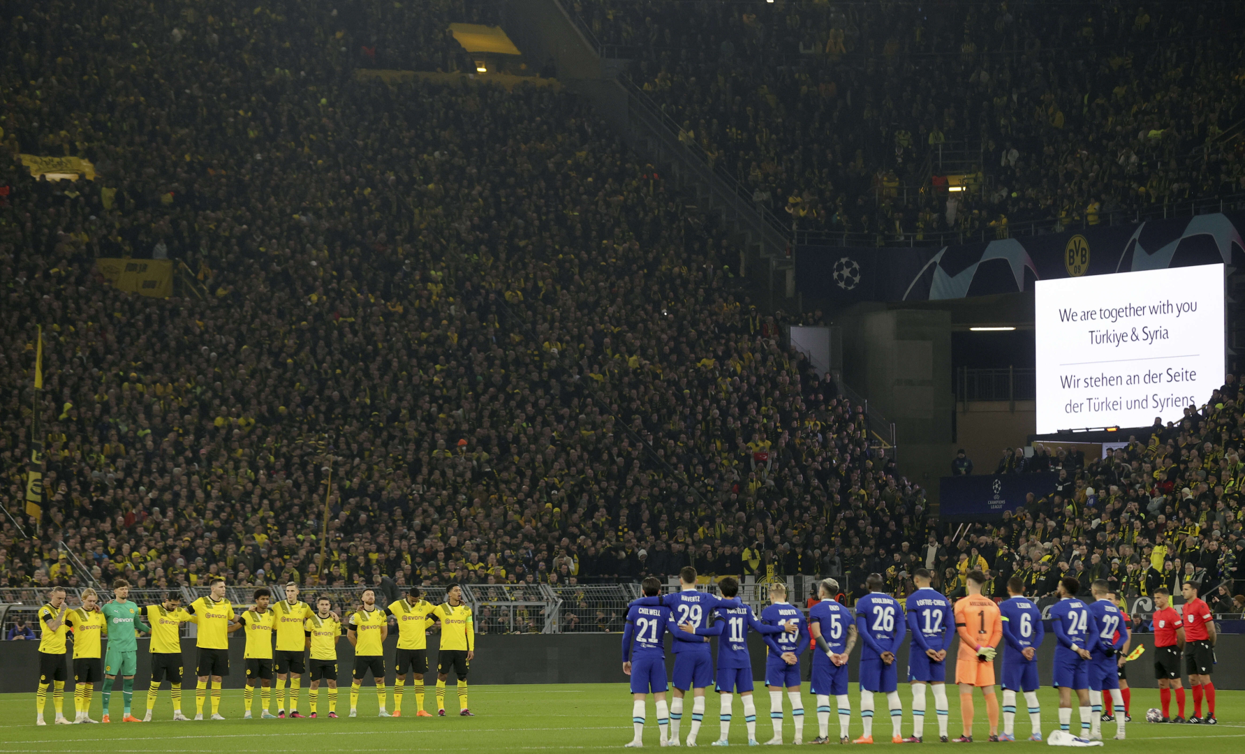 UEFA Şampiyonlar Ligi'nde oynanan Borussia Dortmund-Chelsea ve Club Brugge-Benfica maçları öncesi Kahramanmaraş'ta meydana gelen depremler nedeniyle hayatını kaybedenler için takımlar saygı duruşunda bulunulurken, Almanya'daki mücadelede "Yanınızdayız" pankartı açıldı.