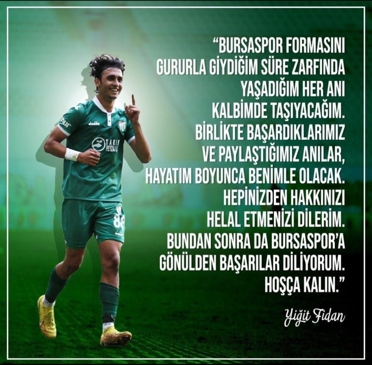 Bursaspor altyapısından yetişen Yiğit Fidan, Fenerbahçe’ye transfer oldu. Sözleşmesini geçtiğimiz aylarda tek taraflı olarak fesheden 19 yaşındaki futbolcu, yeşil-beyazlı kulüp için veda mesajı yayımladı. Yiğit, sosyal medya hesabından yaptığı paylaşımda, “Bursaspor formasını gururla giydiği süre zarfında yaşadığım her anı kalbimde taşıyacağım. Birlikte başardıklarımız ve paylaştığımız anılar, hayatım boyunca benimle olacak. Hepinizden hakkınızı helal etmenizi dilerim. Bundan sonra da Bursaspor’a gönülden başarılar diliyorum. Hoşça kalın" ifadelerini kullandı. Bursaspor Kulübü’nün Yiğit Fidan’dan yetiştirme bedeli dışında para kazanıp kazanmayacağı henüz netlik kazanmadı.