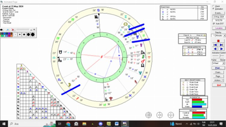 23 Mayıs 2024 tarihinde Bursa’ya göre çıkartılan haritada saat 16:53’te Yay Burcu’nda bir “Dolunay” gerçekleşecek.