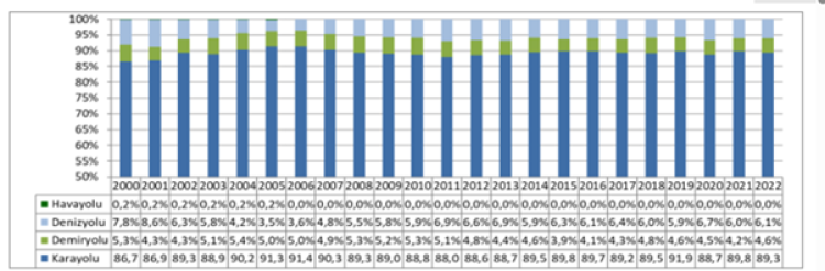 Enerjide dışa bağımlılığımız bir tarafa, çevresel etkileri açısından deniz ve demiryollarının kullanımının karayollarına tercih edilmesi gerekmekte. Demiryolu ağının geliştirilmesinin yanında verimli olarak kullanılması da önem taşımakta. Her ne kadar demiryollarında 2013 yılında yük taşımacılığı kapasite kullanım oranı yüzde 75’e çıkmışsa da 2021 yılında yüzde 51’e gerilediğini izlemekteyiz. Burada üretim yapılan yerlerin (OSB vb.) demiryolu ve limanlara uzak veya bağlantılarının yeterli olmaması önemli bir etken olarak karşımıza çıkıyor.