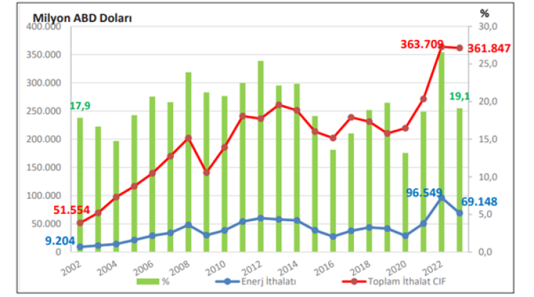 2002-2023 Türkiye’nin ithalatında enerjinin payı: