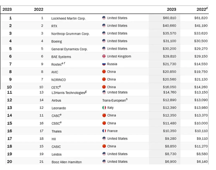 Kısa adı SIRPI olan Stockholm Uluslararası Barış Araştırmaları Enstitüsü, 2024 yılı raporunda satışlara göre en büyük 20 savunma sanayi şirket ve ülkelerini sizlerle paylaşmak istiyorum. Şirket isimleri muhtemelen tanıdık gelecektir, birçoğu halka açık ve karlılık amacı yüksek kuruluşlar: