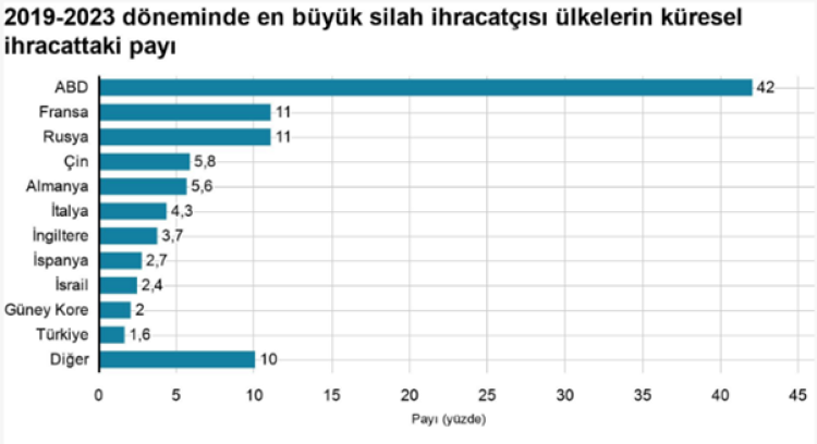 Dünyanın en büyük ihracatçısı olmaya devam eden ABD'nin silah ihracatı, 2019-23 döneminde yüzde 17 oranında arttı ve ülkenin toplam küresel silah ihracatındaki payı yüzde 34'ten yüzde 42'ye yükseldi.