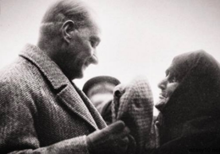 Köylü kadın bu sözleri duyunca şaşkına döndü. Elindeki değneği yere fırlatıp, Atatürk’ün ellerine sarıldı.