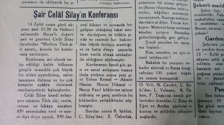 Yazımın sonundaki gazete haberini incelemenizi tavsiye ediyorum. Haberdeki şu cümleyi okumanız Celal Sılay’ın önemini anlamanız için yeterli: [Halkevi’nin kullandığı Zevk Sineması’nda yapılan] “Konferans âni olarak tertip edildiği halde bilhassa gençlik arasında çok büyük bir alâka uyandırmış, salon tamamen dolmuş ve birçok kimseler ayakta dinlemek mecburiyetinde kalmışlardır.”